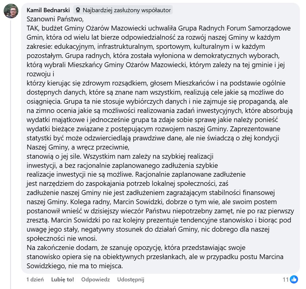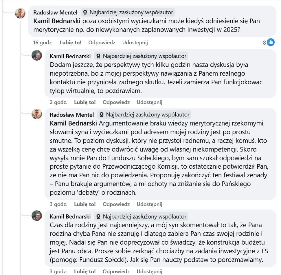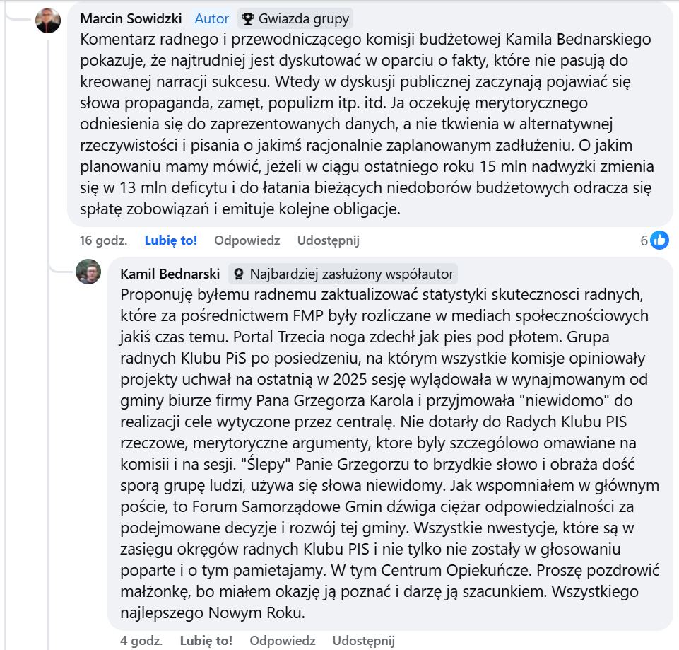 Tymczasem na forum, zamiast merytorycznej dyskusji pojawiły się osobiste wycieczki i niepotrzebne emocje. Bo czy to, że radny (będący zarazem przewodniczącym Komisji Rewizyjnej) zadaje pytania i punktuje władze gminy, faktycznie nic dobrego nie wnosi? Czy można krytykować mieszkańców za to, że czegoś nie wiedzą, nie rozumieją, a chcieliby się dowiedzieć? Z drugiej strony – czy da się tak trudny i złożony temat jak wielomilionowy budżet gminy omówić sensownie w kilku nawet akapitach komentarza? A może po prostu potrzeba lepszej komunikacji i oparcia debaty na faktach, a nie emocjach?