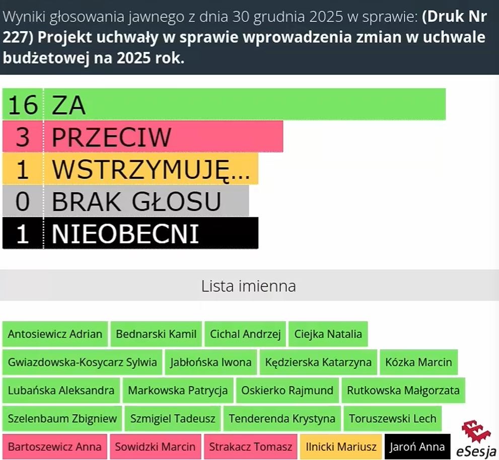 30.12.2025 odbyła się niemal 4-godzinna sesja Rady Miejskiej. Głównymi tematami były: zmiana uchwały budżetowej na rok 2025, uchwała budżetowa na rok 2026 oraz Wieloletnia Prognoza Finansowa. Według słów przewodniczącego Komisji Budżetowej, radnego Kamila Bednarskiego, planowane dochody w 2026 roku to prawie 384 mln zł, wydatki – prawie 368 mln zł. Planowana nadwyżka, jak łatwo policzyć, 16 mln zł.
