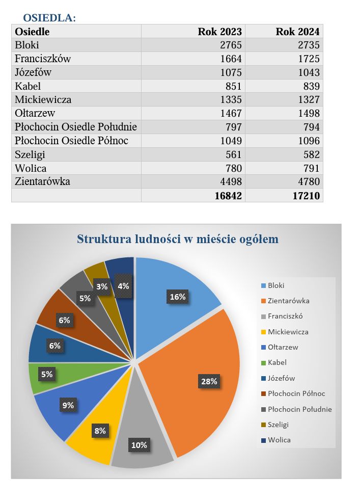 - Najbardziej zaludnione osiedla to Zientarówka (4780 osób) oraz Bloki (2735 osób),
