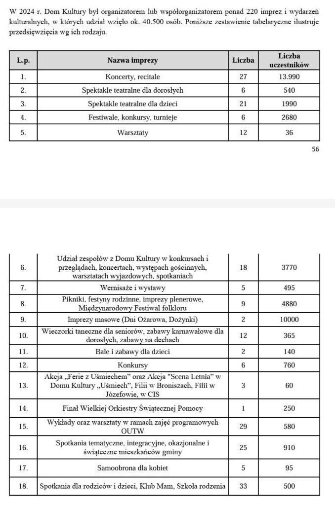 - Ponad 220 imprez i wydarzeń organizowanych lub współorganizowanych przez DK Uśmiech, ok. 40,5 tys. uczestników,