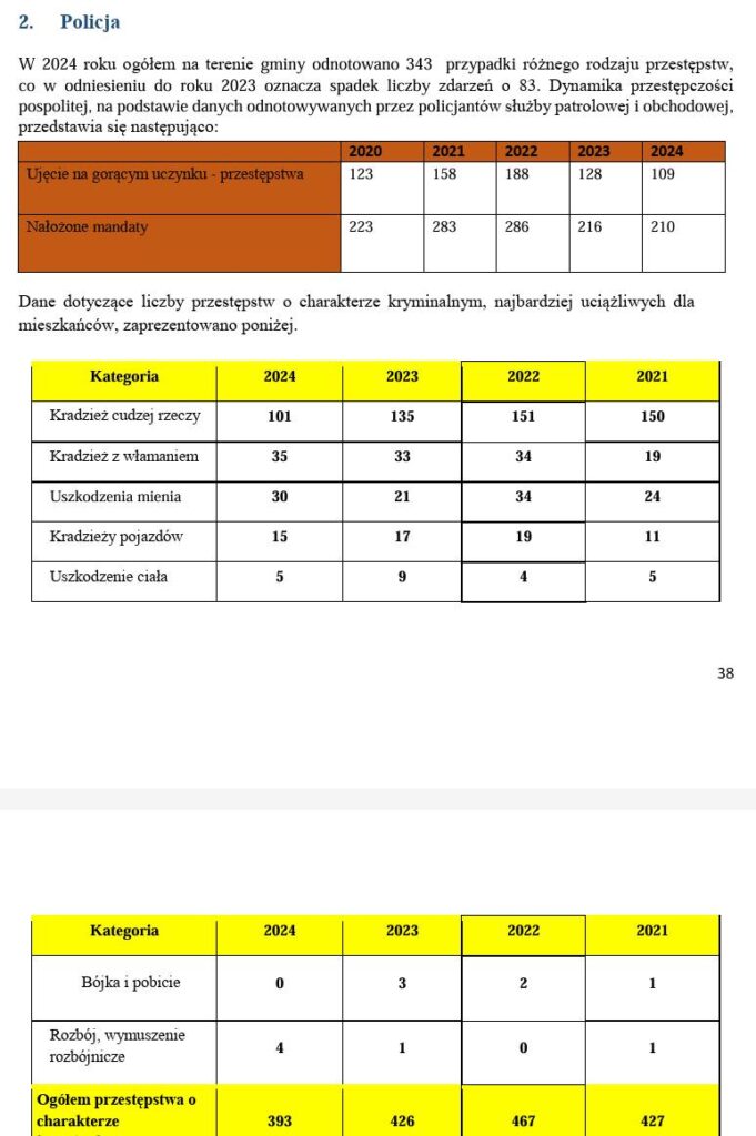 - 343 przestępstwa w 2024 roku (spadek o 83 względem 2023), z czego zdecydowana większość to kradzieże,