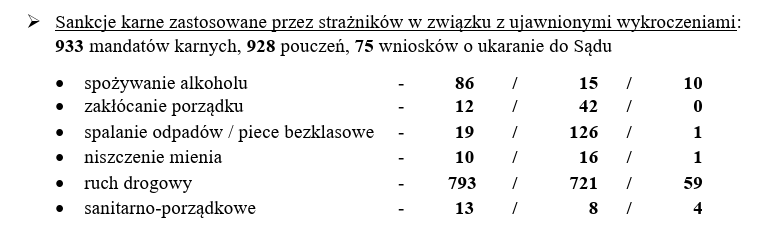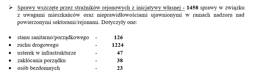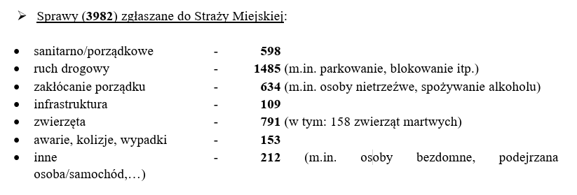 - 3982 zgłoszeń (z czego 2908 – 73% – pochodziło od mieszkańców, a pozostałe z policji, strażaków, instytucji czy monitoringu), które poskutkowały liczbą aż 10860 podjętych przez strażników interwencji/czynności (nie uwzględniając działań prewencyjnych). Daje to średnią liczbę 11 zgłoszeń dziennie.