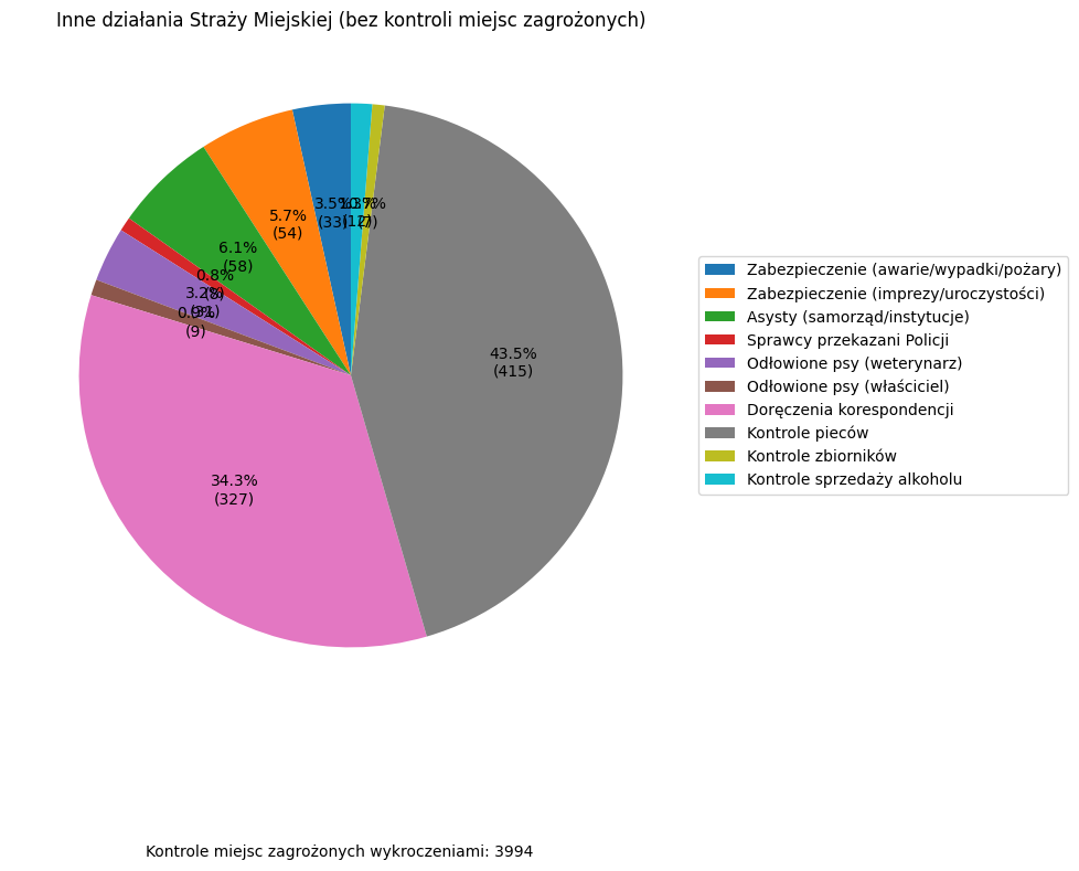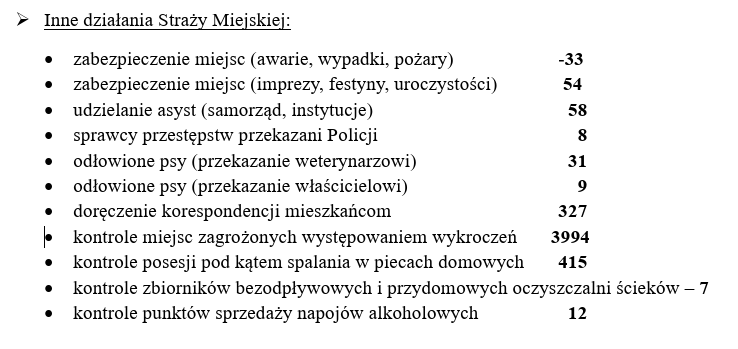 - Inne działania Straży Miejskiej to w dominującej większości aż 3994 „kontrole miejsc zagrożonych występowaniem wykroczeń„. Podział pozostałych działań prezentuje się następująco: